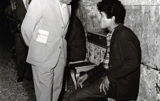 Levi, Primo: fotografia originale nella quale è ritratto Primo Levi sul palco della giuria durante il Premio Strega: 18 x 24 cm. Gelatina ai sali d’argento stampata su sottile carta fotografica detta anche “carta matta”. La fotografia risale al 1964, mentre la stampa è degli anni Settanta. Al retro timbro a tampone blu dell’agenzia fotografica Dufoto e timbro a tampone blu di Aldo Durazzi. Una imperfezione millimetrica all’angolo alto sinistro, ma ben conservata.