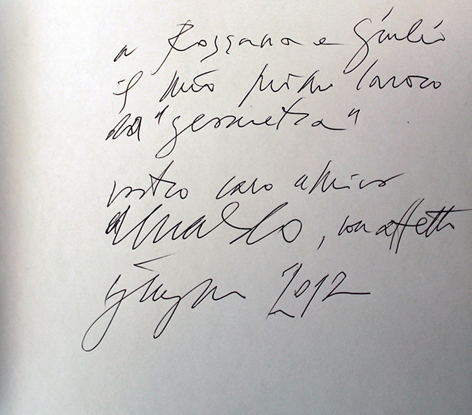 Pomodoro, Arnaldo: Carapace. La cantina della Tenuta Castelbuono, Bologna, Editrice Compositori, 2012, 27,5 x 24 cm. Brossura editoriale; pp. 140, (4). Dedica autografa firmata e datata (2012) di Pomodoro: A Rossana e Giulio il mio primo lavoro da “geometra”Edizione originale.