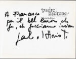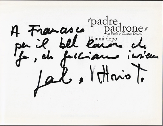 Taviani, Paolo e Vittorio: Padre padrone. 30 anni dopo, Milano, Federico Motta Editore, 2007, 17,5 x 24 cm. Cartone editoriale; pp. 143, (3). A cura di Lorenzo Codelli. Con molte fotografie di scena a colori e in bianco e nero di Umberto Montiroli. Allegato al libro un DVD con il film, immagini girate durante il Festival di Cannes del 1977 nel quale il film vinse la Palma d’oro, e due interviste ai fratelli Taviani. Nel volume interviste a: Gilles Jacob, Omero Antonutti, Saverio Marconi, Mario Masini, Nanni Moretti, Marco Bellocchio. Saggi di: Pauline Kael, Françoise Giroud, Werner Herzog. Dedica autografa firmata di Paolo e Vittorio Taviani: A Francesco per il bel lavoro che fa, che facciamo insiemeEdizione originale.